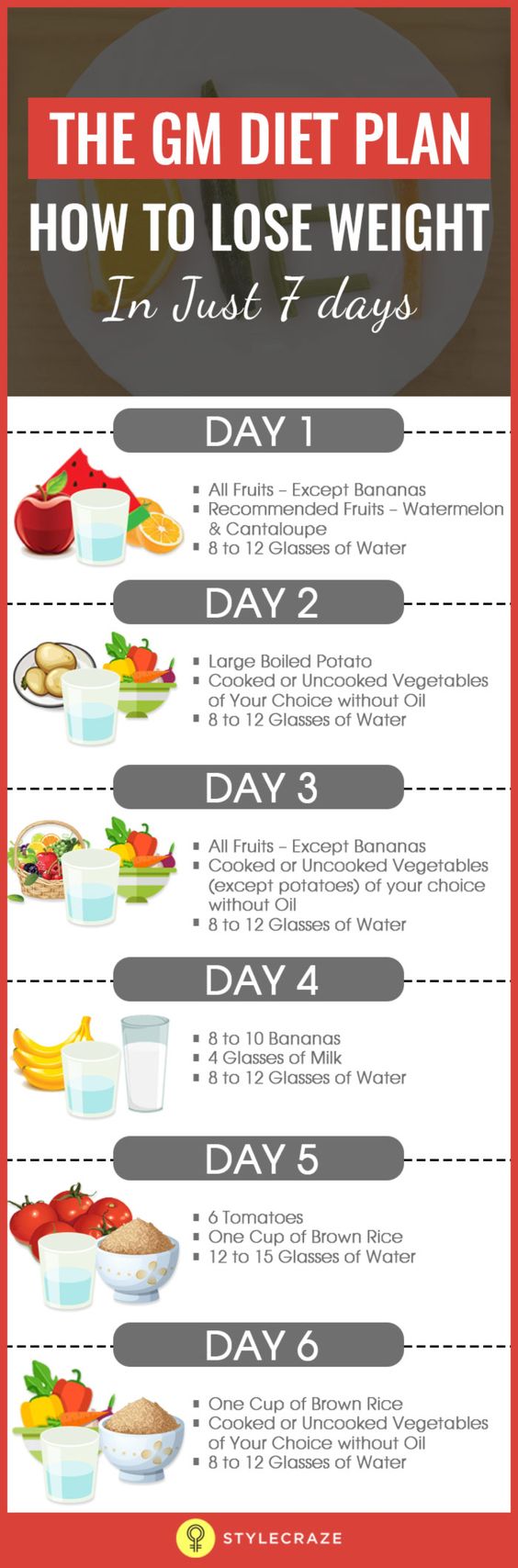 Berbeda dari kebanyakan metode diet lainnya (misalnya diet mayo), diet GM mengharuskan dan membatasi peminatnya untuk mengonsumsi makanan tertentu selama 1 minggu. Setiap harinya, akan ada menu yang berbeda untuk dikonsumsi.